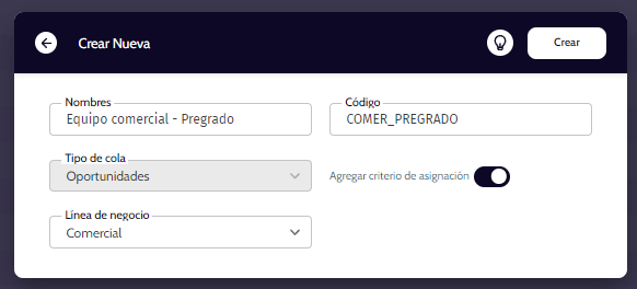 • Agregar Criterio de asignación: Selecciona este check si deseas vincular tu equipo a una línea de negocio específica, de forma que la designación se haga de acuerdo a la línea de negocio que relaciones.