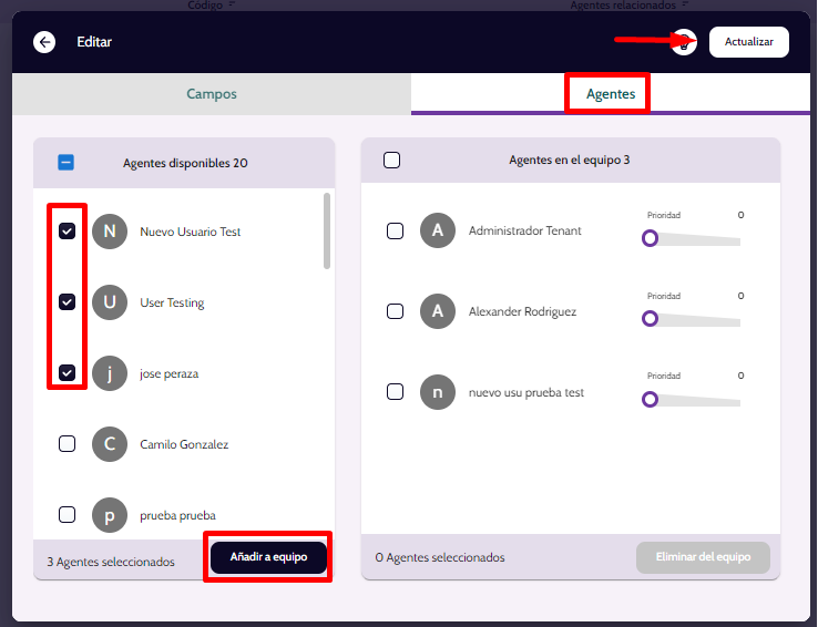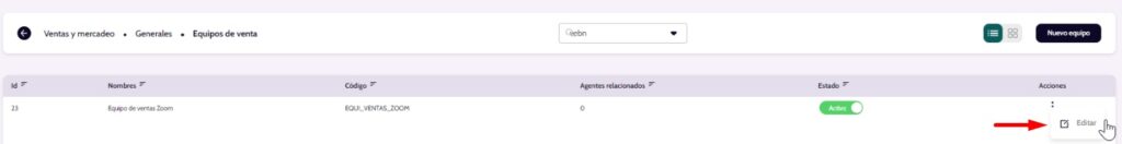 Una vez has realizado la creación del equipo de ventas ingresa a la vista de edición de este y realiza la asignación de los agentes que conformaran el equipo.