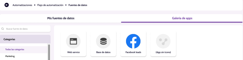 Este modulo nos permite conectarnos con diferentes tipos de fuentes como: bases de datos, web services, archivos de Google Sheets de drive, Facebook, entre o otros sistemas, y a partir de esta conexión, definir flujos lógicos para la ejecución, de actividades puntuales. ten en cuenta que la cantidad de fuentes de datos que debas configurar dependerá del número de conexiones externas o internas que se requieran.