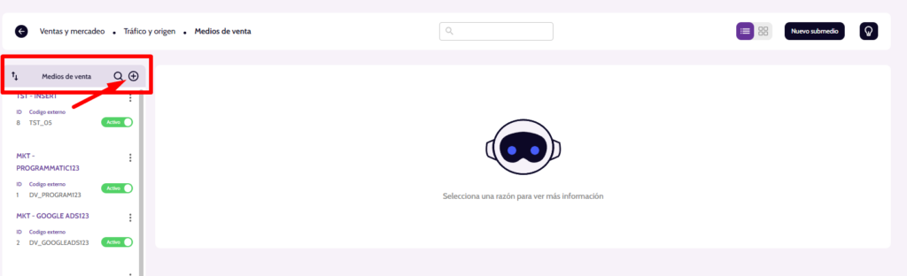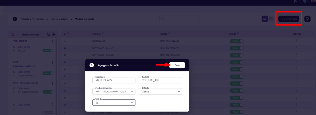 Paso 3: Botón para creación de un nuevo Submedio de venta