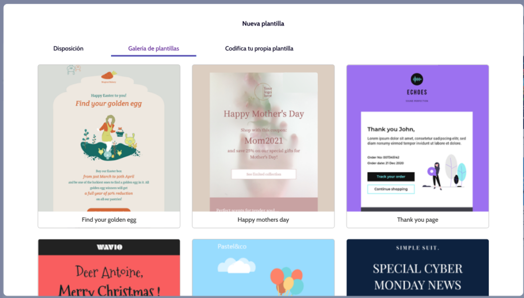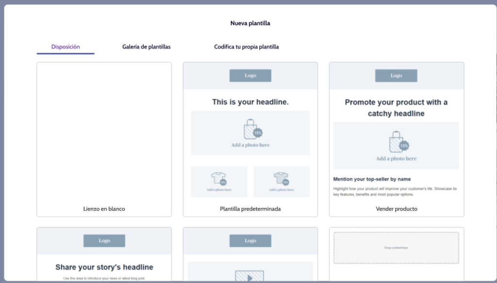 • Galería de plantillas: Te  permite escoger diseños predefinidos que puedes usar para la creación de tu plantilla.