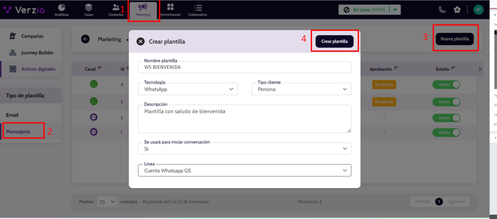 - Línea: Escoge la línea de WhatsApp por la cual se realizara el envío de la plantilla