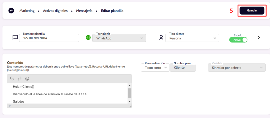 - Da clic en el botón “Guardar” para que tu plantilla se envié a aprobación por Facebook.