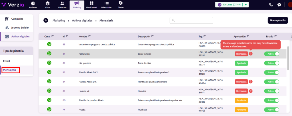 - Aprobada: Plantilla que ya puede ser usada en el uso de las comunicaciones.