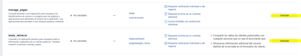 Después de estas peticiones, debemos esperar máximo de 24 horas para que Facebook active el botón antes mencionado para los permisos pages_manage_metada, pages_show_list y pages_read_engagement.