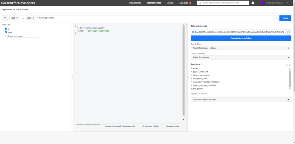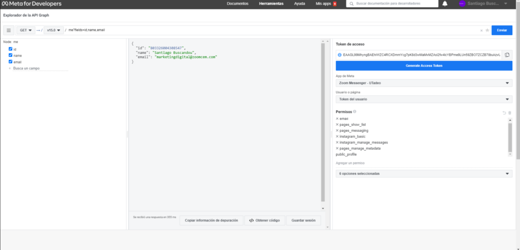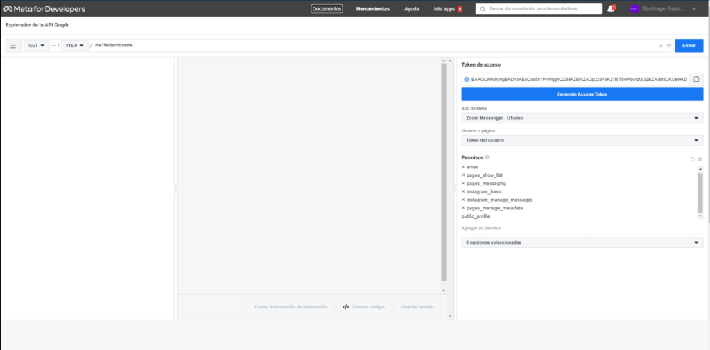 7. En caso de que la data no corresponda a la fan-page que deseamos, debemos volver a seleccionar “Generate Access Token” y en el modal que salga, retroceder para seleccionar los datos correctos, luego volver a hacer el paso 6.