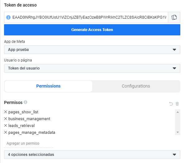 2. Seleccionar el app creada en “App de Meta” y seleccionar los permisos: ”leads_retrieval”, “pages_manage_metadata”, “pages_show_list” y “business_management” (permite obtener las páginas asociadas a los business).