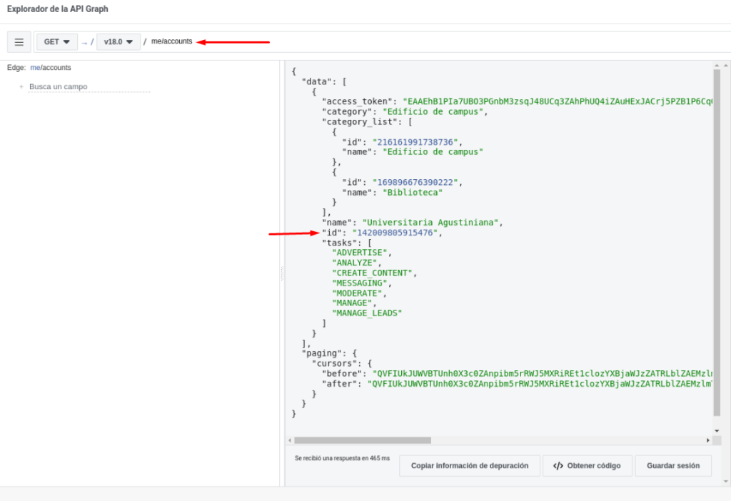 6. Si efectivamente devuelve data, verificamos que sea de la fan-page que deseamos integrar, de ser así, tomamos el ID de la fan-page el cual se encuentra en el campo “id” (NO tomar el que se encuentra en category_list) y lo guardamos, ya que lo usaremos en los siguientes pasos, por último tomamos el token generado (en la sección Token de acceso) y lo agregamos en el app registrada en el CRM (donde el token fue 123).