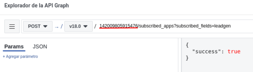 11. Ahora debemos ejecutar una petición POST usando el endpoint “IDFACEBOOK/subscribed_apps?subscribed_fields=leadgen” (similar a lo que se hizo en el paso 5), en donde “IDFACEBOOK” es el ID que se guardó en pasos anteriores, al ejecutar debe verse una respuesta true, de lo contrario se deberá investigar que falta.