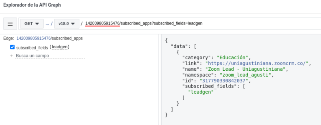 12. Por último, se puede hacer una petición GET usando el mismo endpoint “IDFACEBOOK/subscribed_apps?subscribed_fields=leadgen” y de esta manera verificamos que efectivamente quedo la suscripción.