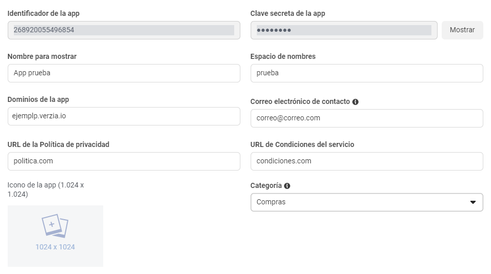 Ahora, en el modal de configuración de la fuente en Verzia, deberás poner la información de “Identificador del anuncio” y “Clave secreta de la app” (Se toman de la configuración de APP en Facebook) y en el campo “Token” debes poner un valor inventado, ejemplo: 123.