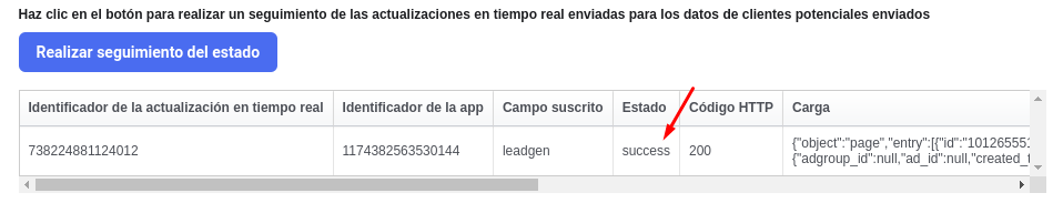 4. Luego en la sección “Realizar seguimiento de estado” dar clic, y en el cuadro de datos que se nos muestra verificar que el campo estado diga “Success”