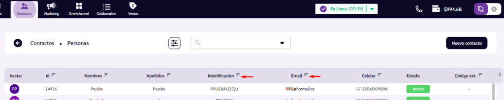 1. Desde el módulo de contactos busca al cliente por su número de documento o correo electrónico (Registrados durante la prueba)
