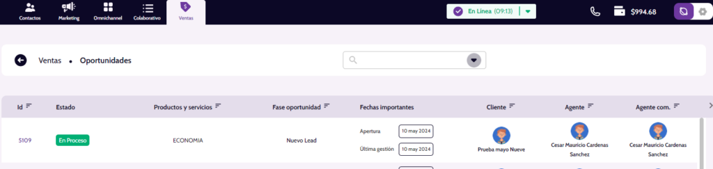 Otra forma de verificar el registro de prueba es desde el módulo de ventas, en donde también se debe buscar por el número de documento del cliente de prueba, y verificar que el lead generado coincida con el producto/servicio predefinido o seleccionado desde el formulario. Por último, asegúrate de verificar que el detalle del lead se haya creado con las fuentes y medios seleccionados en la configuración del anuncio en Verzia.