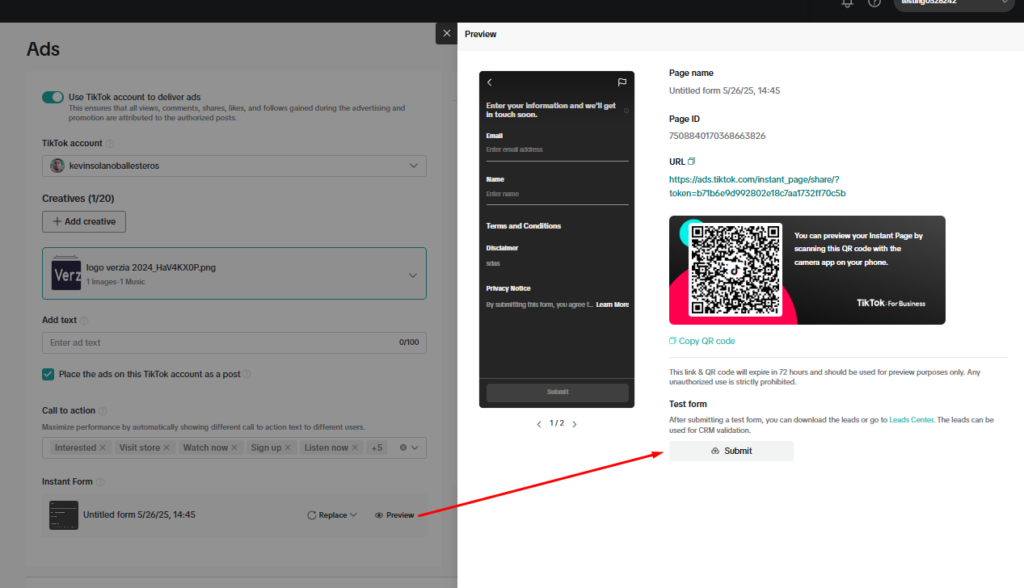 Una vez hayas realizado la configuración de tu anuncio de TikTok, podrás verificar que él anunció quedo correctamente conectado, haciendo pruebas realizando los siguientes pasos: