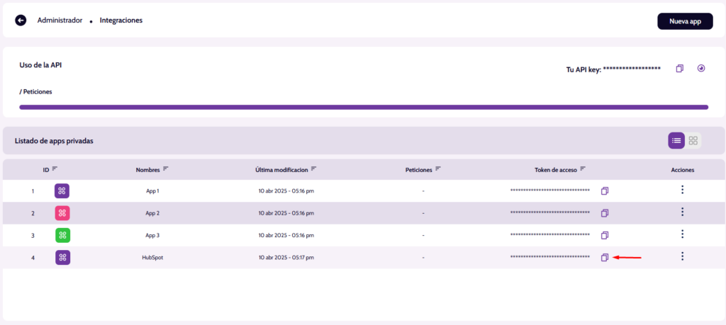 III. Una vez creada la app ve a la app que has credo y copia el token de esta, este sera el dato necesario para la conexión con HubSpot